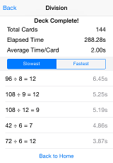 The app counts the time spent on each question/answer card and shows the results at the end. You can sort your results by fastest or slowest times to see where you need to improve.
